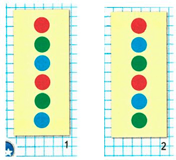 Отличия двух картинок в том, что на первой картинке вторая фигура – это зелёный круг, а на второй картинке – синий круг; третья фигура на первой картинке – это синий круг, а на второй картинке – зелёный круг; пятая фигура на первой картинке – это зелёный круг, а на второй картинке – синий круг; последней фигурой на первой картинке является синий круг, а на второй картинке – зелёный круг.