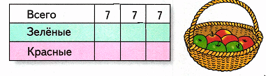 Краткое условие: В корзине были яблоки: красные и зелёные, всего 7 яблок. Зелёных яблок было меньше, чем красных. Покажи с помощью таблицы, сколько красных и сколько зелёных яблок могло быть в корзине.