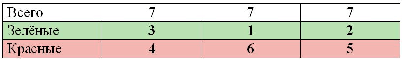 2) Покажем с помощью таблицы, сколько красных и сколько зелёных яблок могло быть в корзине при условии, что всего яблок было 7 и при этом зелёных яблок было меньше, чем красных: