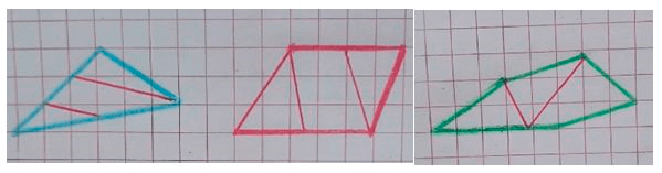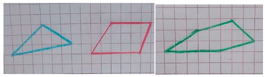 3) Проведем в каждой фигуре по 2 отрезка так, чтобы, разрезав по ним каждую фигуру, можно было получить 2 треугольника и 1 четырёхугольник: