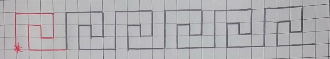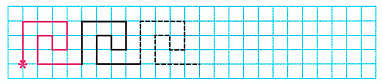 Три клетки вверх, три клетки вправо, две клетки вниз, одна клетка влево, одна клетка вверх, одна клетка влево, две клетки вниз, три клетки вправо.