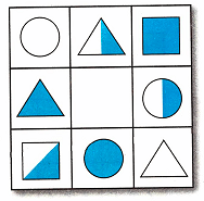 По форме в каждом ряду и каждом столбце фигуры чередуются следующим образом: круг, треугольник, квадрат. По цвету в каждом ряду и каждом столбце закрашивание чередуется следующим образом: не закрашенная фигура, наполовину закрашенная фигура, полностью закрашенная фигура.