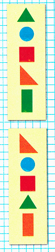 Отличия двух картинок в том, что на первой картинке первая фигура – это зелёный треугольник, а на второй картинке – оранжевый треугольник; четвёртая фигура на первой картинке – это оранжевый треугольник, а на второй картинке – зелёный треугольник; последней фигурой на первой картинке является зелёный прямоугольник, а на второй картинке – оранжевый прямоугольник.