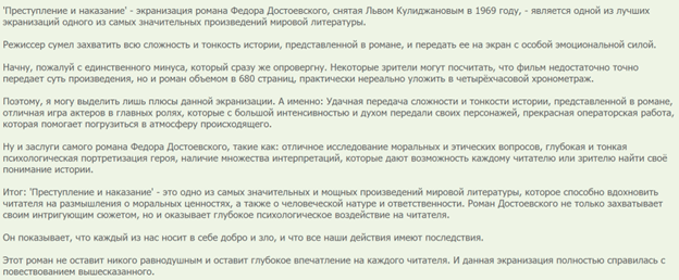 Фильм Льва Кулиджанова «Преступление и наказание» в двух частях снят по одноименному роману Ф.М. Достоевского. Фильм чёрно-белый, съемки проводились в Петербурге, что позволило передать атмосферу мрачного и душного Петербурга Достоевского. Режиссер сохранил основные сюжетные повороты, он также оставил внутренние монологи Раскольникова, что позволяет зрителям глубже проникнуть во внутренний мир героя. Зритель может понять идеи романа Достоевского при просмотре фильма, поскольку режиссер максимально полно передал художественный замысел писателя. Григорий Тараторкин сыграл надломленного собственной идеей, мечущегося Раскольникова. Для Татьяны Бедовой фильм был дебютным, она смогла передать кротость и набожность Сони. Фильм достоверно воссоздаёт то напряжение, которое возникает при чтении романа, благодаря неторопливым диалогам и правильным декорациям. Мне фильм понравился, поскольку он полно отражает роман Достоевского, в нём нет субъективных интерпретаций режиссера, сценарий идёт строго по тексту романа.