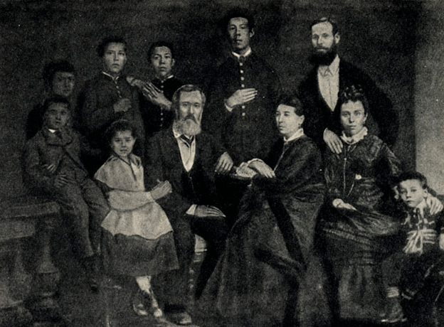 Семья Чеховых. Стоят: Иван, Антон, Николай, Александр Чеховы и дядя М.Е. Чехов. Сидят: Михаил, Мария, Павел Егорович, Евгения Яковлевна Чеховы, тётя писателя Л.П. Чехова и двоюродный брат Георгий
