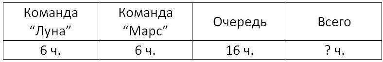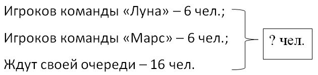 Краткое условие: На поле 6 игроков команды «Луна» и столько же игроков команды «Марс». Ждут своей очереди ещё 16 игроков. Сколько всего человек в обеих командах?