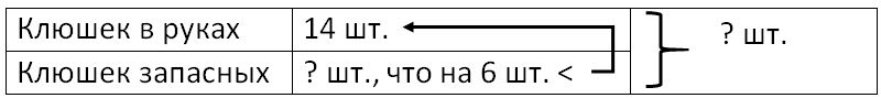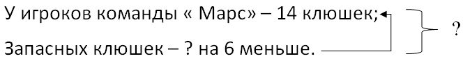 Краткое условие: В руках у игроков команды «Марс» 14 клюшек, а запасных клюшек на 6 меньше. Сколько всего клюшек у команды «Марс»?