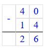 40 - (7 + 7) = 40 - 14 = 26;