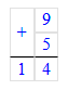 2. Складываю единицы. Сумма чисел 9 и 5 равняется 14. 14 единиц – это 1 десяток и 4 единицы. Пишу 4 под единицами, а 1 десяток запомню и прибавлю к десяткам.