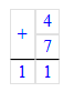 2. Складываю единицы. Сумма чисел 4 и 7 равняется 11. 11 единиц – это 1 десяток и 1 единица. Пишу 1 под единицами, а 1 десяток запомню и прибавлю к десяткам.