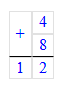 2. Складываю единицы. Сумма чисел 4 и 8 равняется 12. 12 единиц – это 1 десяток и 2 единицы. Пишу 2 под единицами, а 1 десяток запомню и прибавлю к десяткам.