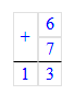 2. Складываю единицы. Сумма чисел 6 и 7 равняется 13. 13 единиц – это 1 десяток и 3 единицы. Пишу 3 под единицами, а 1 десяток запомню и прибавлю к десяткам.