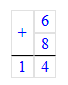 2. Складываю единицы. Сумма чисел 6 и 8 равняется 14. 14 единиц – это 1 десяток и 4 единицы. Пишу 4 под единицами, а 1 десяток запомню и прибавлю к десяткам.