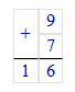 2. Складываю единицы. Сумма чисел 9 и 7 равняется 16. 16 единиц – это 1 десяток и 6 единиц. Пишу 6 под единицами, а 1 десяток запомню и прибавлю к десяткам.