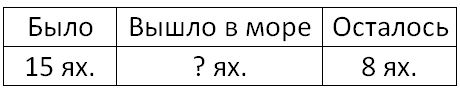 Краткое условие: У лодочной станции было 15 яхт. Когда несколько яхт вышло в море, осталось 8 яхт. Сколько яхт вышло в море?