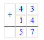 3. 43 + 14 = 57;