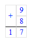2. Складываю единицы. Сумма чисел 9 и 8 равняется 17. 17 единиц – это 1 десяток и 7 единиц. Пишу 7 под единицами, а 1 десяток запомню и прибавлю к десяткам.