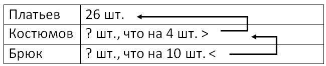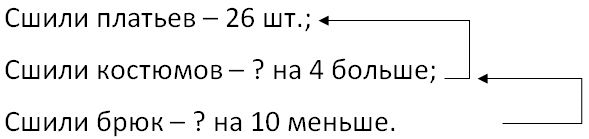 Краткое условие: В ателье сшили 26 платьев, костюмов на 4 больше, чем платьев, а брюк на 10 меньше, чем костюмов. Сколько брюк сшили в ателье?