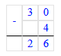 2. Вычитаю единицы. Из 0 нельзя вычесть 4. Беру 1 десяток из 5 десятков. 1 десяток – это 10 единиц. Разность чисел 10 и 4 равняется 6. Пишу 6 под единицами.