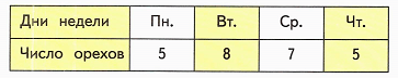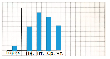Краткое условие: Белка запасала на зиму орехи 4 дня подряд. В таблице показано, сколько орехов белка находила каждый день. Используя таблицу, построй столбчатую диаграмму. (Обозначай 1 орех одной клеткой)