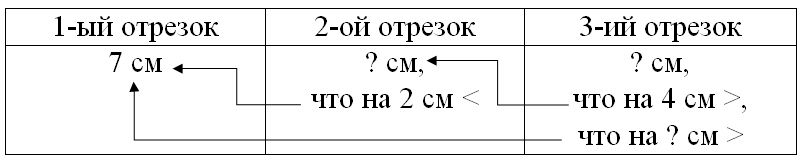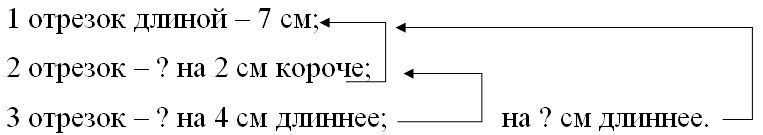 Краткое условие: Ваня начертил три отрезка. Первый длинной 7 см, второй на 2 см короче первого, а третий на 4 см длиннее второго. На сколько сантиметров третий отрезок длиннее первого? Сначала реши задачу, не выполняя чертёж. Проверь себя, выполнив чертёж.