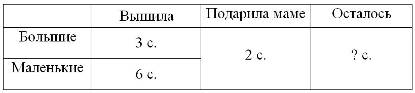Краткое условие: Аня вышила 6 маленьких салфеток и 3 большие. Она подарила маме 2 салфетки. Сколько салфеток осталось у Ани?