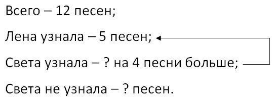 Краткое условие: Девочки участвовали в игре «Угадай мелодию». Лена из 12 песен узнала только 5, а Света узнала не только те, что и Лена, но и ещё 4 песни. Сколько песен не узнала Света? Составь выражение по задаче и реши её.