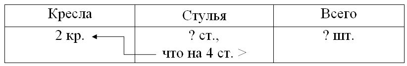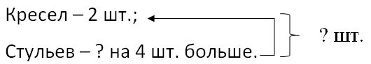 Краткое условие: В комнате стояло 2 кресла, а стульев на 4 больше, чем кресел. Задай вопрос, чтобы задача решалась двумя действиями. Реши её.
