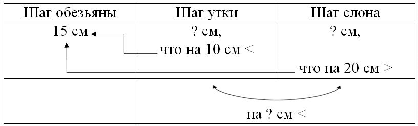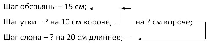 Краткое условие: У Пети три игрушки: обезьяна, утка и слон. Петя определил, что шаг обезьяны 15 см, утки на 10 см короче, а слона на 20 см длиннее, чем обезьяны. На сколько сантиметров шаг утки короче шага слона? Объясни разные способы решения.