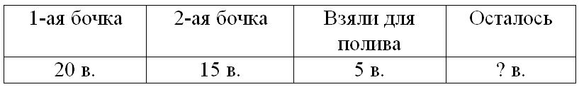 Краткое условие: Реши задачи разными способами. 1) В одной бочке было 20 вёдер воды, а в другой — 15 вёдер. Для полива взяли 5 вёдер воды. Сколько вёдер воды осталось? 2) В кувшине было 12 стаканов молока. На кашу пошло 5 стаканов молока, а на омлет — 2 стакана. Сколько стаканов молока осталось?
