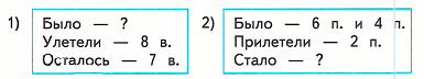 1. На ветке сидели воробьи. Когда 8 воробьёв улетело, на ветках осталось сидеть 7 воробьёв. Сколько воробьёв было на ветке изначально?