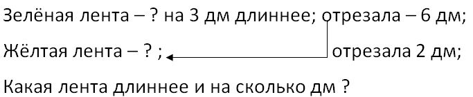 1. Так как зелёная лента на 3 дм длиннее жёлтой, то после отрезания 6 дм от зелёной ленты она стала на 3 дм короче жёлтой.