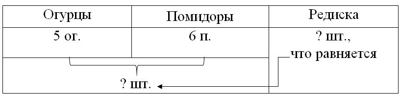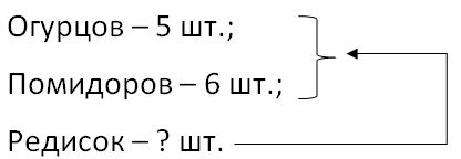Краткое условие: На салат пошло 5 огурцов, 6 помидоров, а редисок столько, сколько огурцов и помидоров вместе. Сколько редисок пошло на салат?