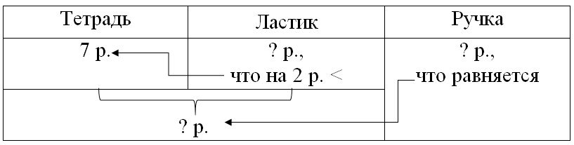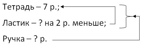 Краткое условие: Тетрадь стоит 7 р., ластик — на 2 р. меньше, чем тетрадь, а ручка — столько, сколько тетрадь и ластик вместе. Сколько стоит ручка? Реши задачу.