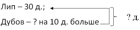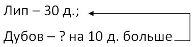 Краткое условие: 1) В парке 30 лип, а дубов на 10 больше. Сколько дубов в парке? 2) В парке 30 лип, а дубов на 10 больше. Сколько всего лип и дубов в парке? Рассмотри выражения и объясни, к какой задаче относится каждое из них.