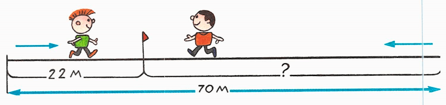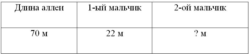 Краткое условие: Длина аллеи 70 м. Два мальчика пошли навстречу друг другу с разных концов аллеи. Один мальчик прошёл до встречи 22 м. Сколько метров прошёл до встречи другой мальчик?