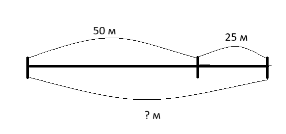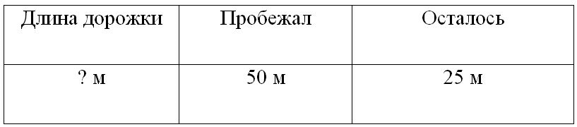 Краткое условие: Когда Митя пробежал 50 м, ему осталось пробежать до конца дорожки 25 м. Узнай длину этой дорожки.