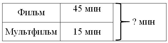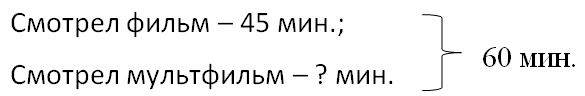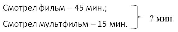 Краткое условие: Вася 45 мин смотрел по телевизору фильм про богатырей и ещё 15 мин — мультфильм. Сколько всего минут Вася смотрел эти фильмы? Составь две задачи, обратные данной. Реши их.