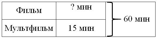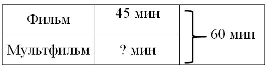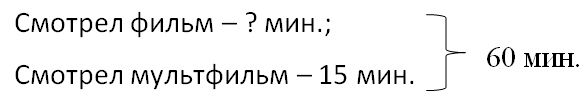 1. Вася смотрел по телевизору фильмы 60 мин. Сколько минут Вася смотрел фильм про богатырей, если мультфильм длился 15 мин?