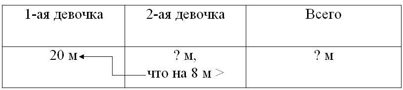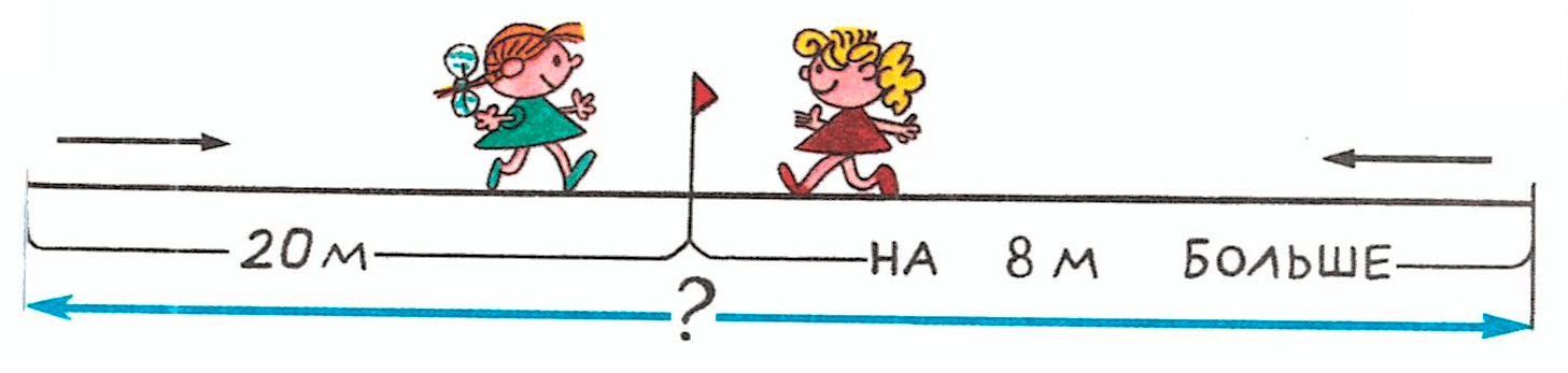 Краткое условие: Две девочки измеряли длину дорожки с двух концов, идя навстречу друг другу. Одна девочка прошла до встречи 20 м, другая — на 8 м больше. Какой длины была эта дорожка?