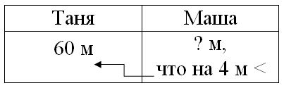 Краткое условие: Таня и Маша бежали наперегонки. Когда Таня пробежала 60 м, Маша отстала от неё на 4 м. Сколько метров пробежала Маша? Сделай схематический чертёж и реши задачу.