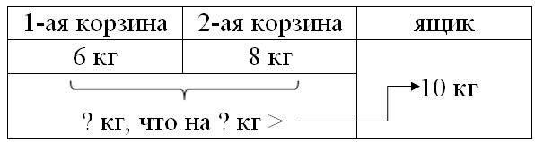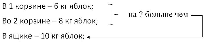 Краткое условие: В одной корзине 6 кг яблок, в другой — 8 кг, а в ящике 10 кг яблок. На сколько килограммов яблок больше в двух корзинах, чем в ящике?