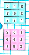 Краткое условие: Сложи числа в каждом квадрате по строкам, по столбцам, из угла в угол. Если суммы равны, то такой квадрат называется магическим.