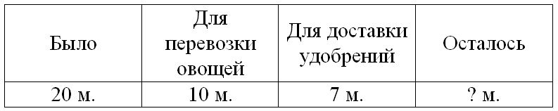 В гараже было 20 грузовых машин. Для перевозки овощей отправили 10 машин, а для доставки удобрений на поля – 7 машин. Сколько машин осталось в гараже?