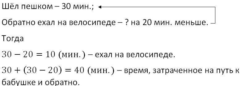 Краткое условие: Саша навестил бабушку. К ней он шёл пешком 30 мин, а обратно ехал на велосипеде и затратил времени на 20 мин меньше. Объясни, что обозначают выражения: