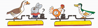 Краткое условие: Рассмотри рисунки, прочитай текст и определи, какая гиря стоит на каждых весах. 1) Масса гуся 7 кг, а кролика 2 кг. 2) Масса курицы 2 кг, а утки 3 кг.
