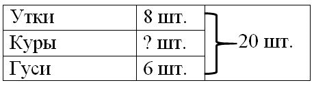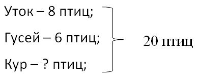 Краткое условие: У бабушки в хозяйстве утки, куры и гуси, всего 20 птиц. Уток 8, гусей 6, а остальные — куры. Сколько кур в хозяйстве бабушки? При решении этой задачи Петя и Коля получили разные ответы: Петя — 14 кур; Коля — 6 кур. У кого из них верный ответ?