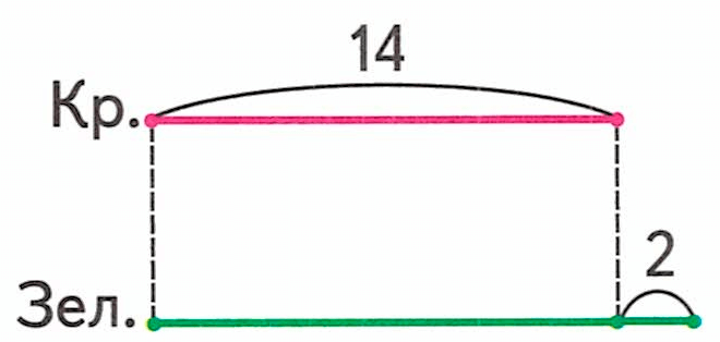 Краткое условие: К празднику купили 14 красных воздушных шариков, зелёных — на 2 больше, чем красных, а синих — столько, сколько красных и зелёных вместе. Рассмотри схематический чертёж и объясни, что обозначают выражения.