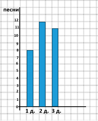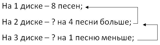 Краткое условие: На первом диске записано 8 песен, на втором — на 4 песни больше, чем на первом, а на третьем — на 1 песню меньше, чем на втором. Сколько песен записано на третьем диске? Используя решение задачи, построй диаграмму.