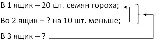 Краткое условие: Дети посадили семена гороха: в первый ящик — 20 штук, во второй — на 10 штук меньше, а в третий — столько, сколько в первый и второй вместе. Сколько семян гороха посадили в третий ящик?